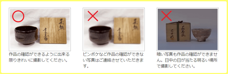 お品物の作家名やタイトル、傷や汚れなどの状態、木箱や鑑定書などの付属品の有無が確認できるようにお写真を撮っていただき、お送りください。